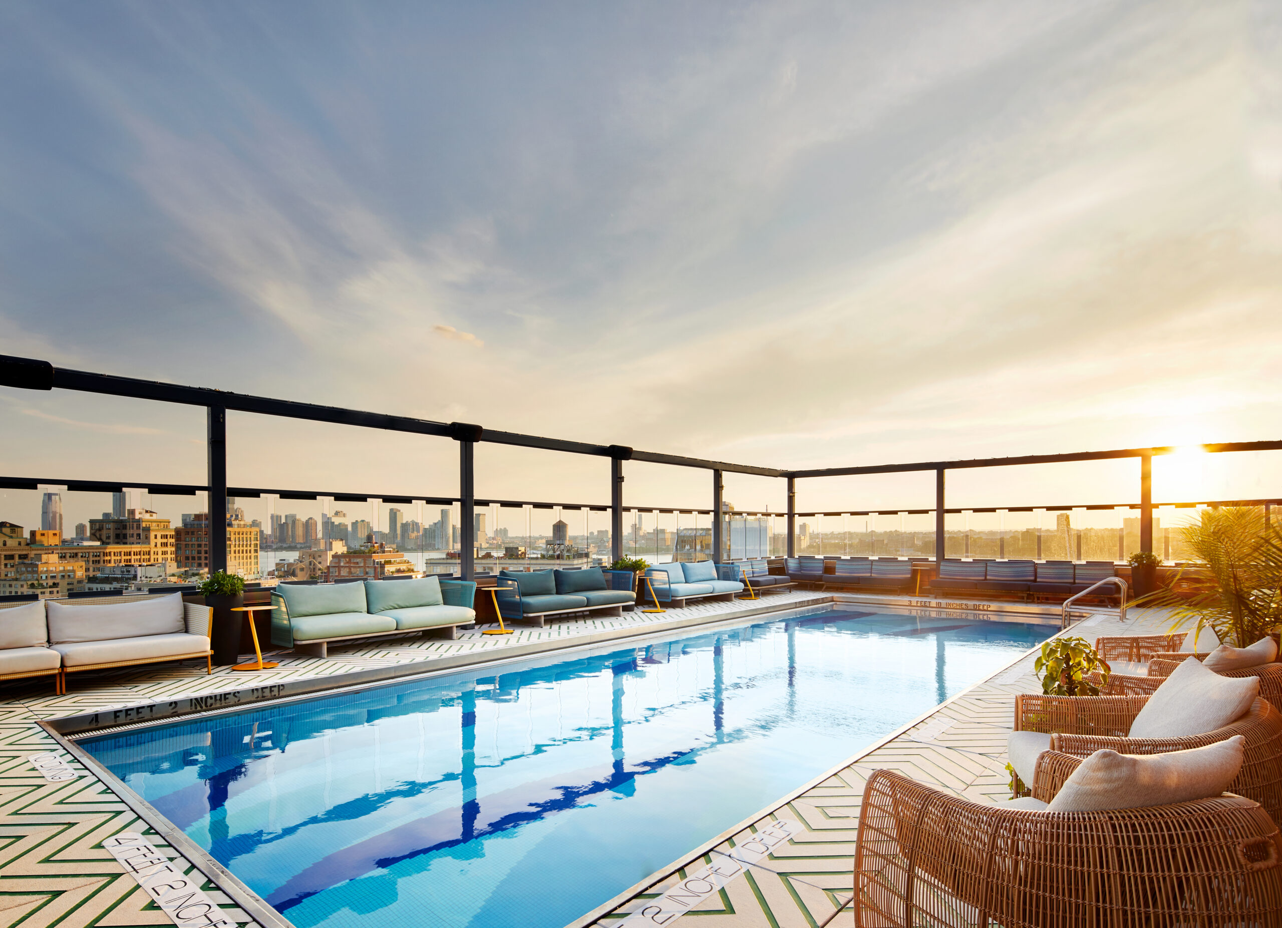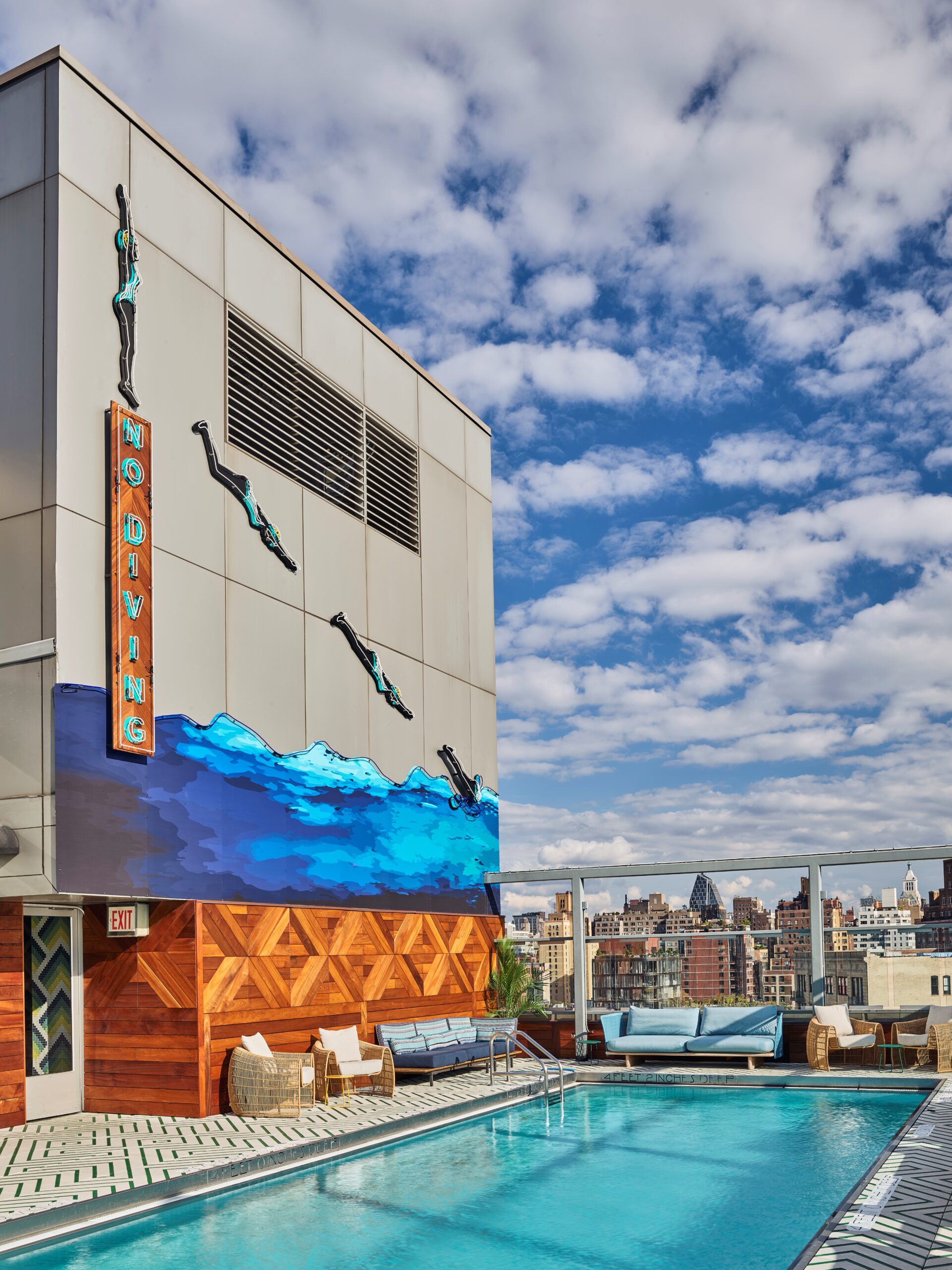 A rooftop pool with stunning views of the city and East River is the definition of fun. We wanted the design to reflect this so we focused on creating a design that was bold with lots of color and movement. Some of the elements we used to do this include a custom concrete paver with tessellating pattern, a huge wall mural with tongue in cheek neon diver graphics and lively textile and furniture colors.